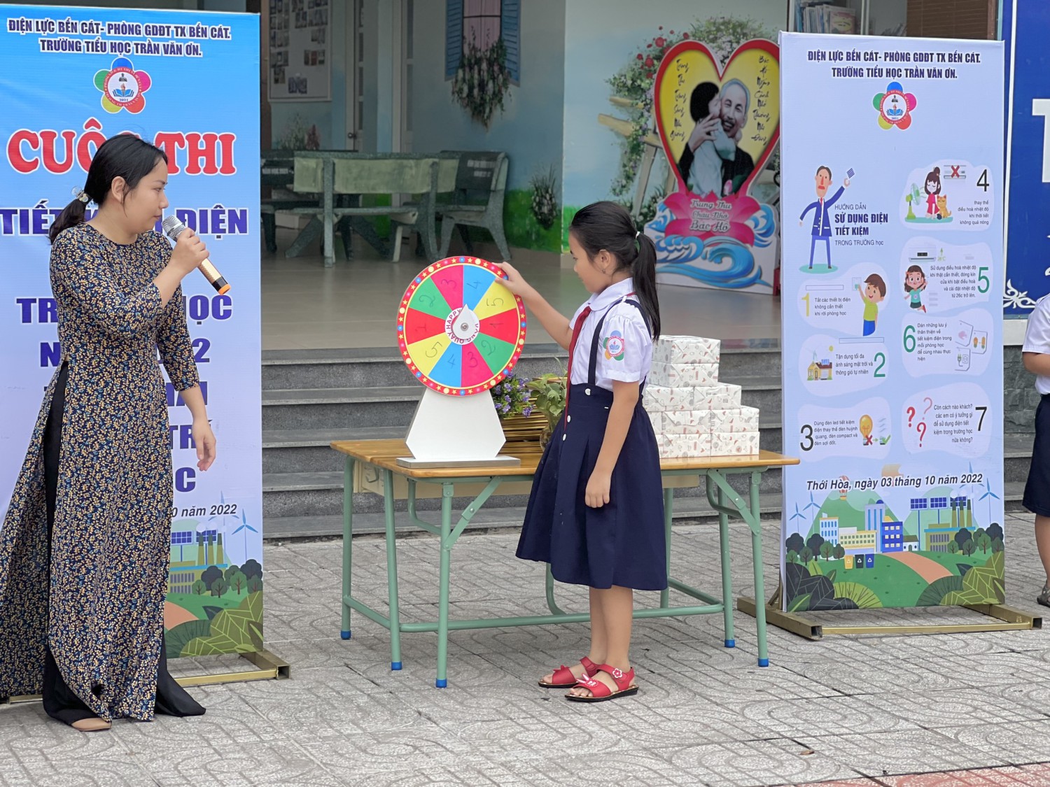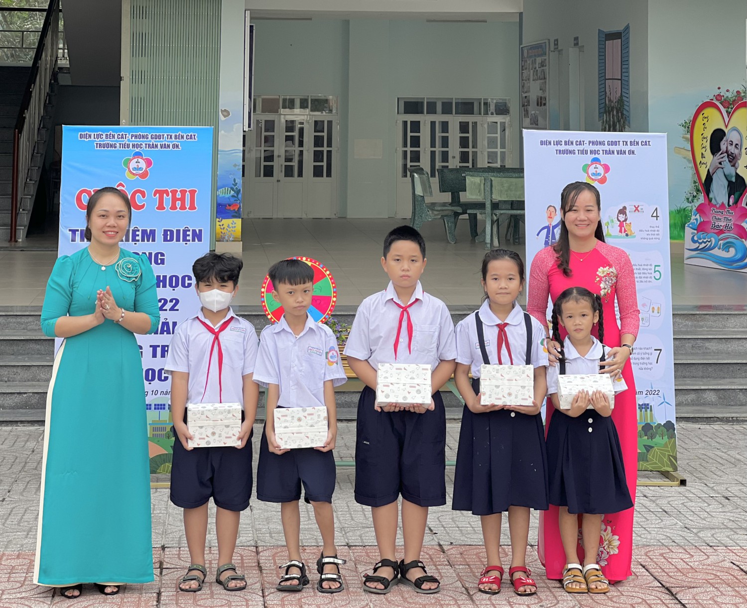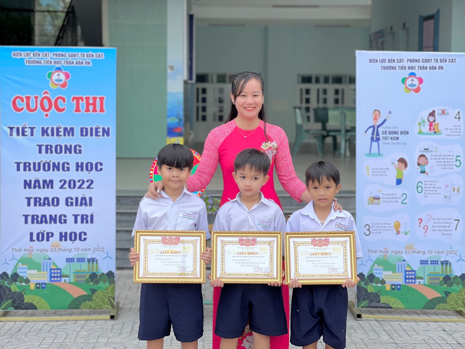 Sáng ngày 03/10/2022 tại sân lễ chào cờ Trường Tiểu học Trần Văn Ơn tổ chức cuộc thi “ Tiết kiệm điện trong trường học” – Năm 2022 do Điện lực Bến Cát phối hợp với Phòng Giáo dục và Đào tạo Thị xã Bến Cát chủ trì, trường phối hợp tổ chức. Đồng thời, trao giải cho Cuộc thi “Trang trí lớp học” với Chủ đề lớp học hạnh phúc.